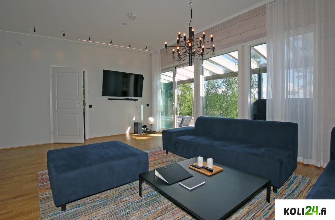 Olohuoneessa on tilava sohva ja rahi, joissa istuen voit ihastella järvimaisemaa tai katsella 65-tuumaista älytelevisiota ja takkatulen loimua. Musta kiiltäväpintainen takka on paikallisen juukalaisen yrityksen, Tulikiven, valmistama.
