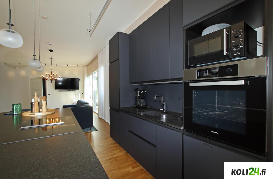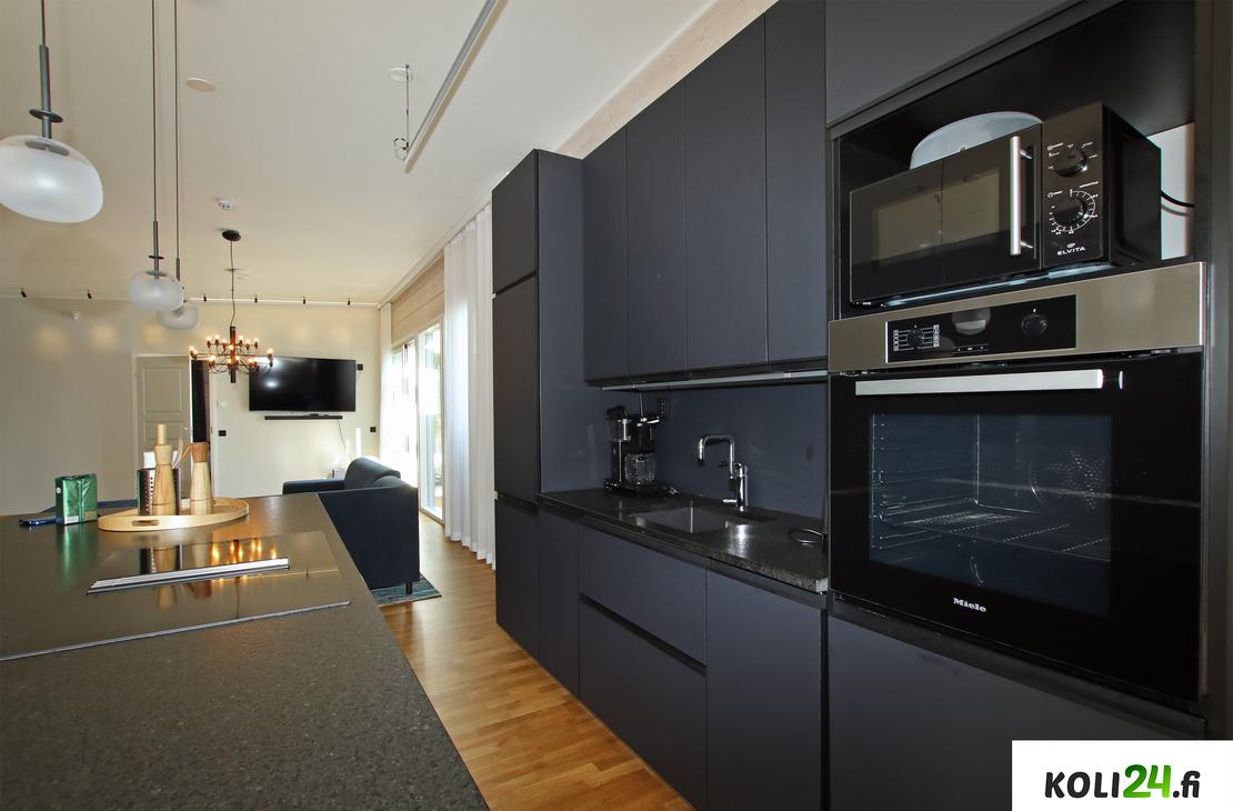 Keittiö on täysin varusteltu ja sieltä löydät 12 hengen astiaston ja keittiövälineiden lisäksi tilavan jääkaappi-pakastin yhdistelmän, uunin, lieden, ja ruokapöydän 8 hengelle.