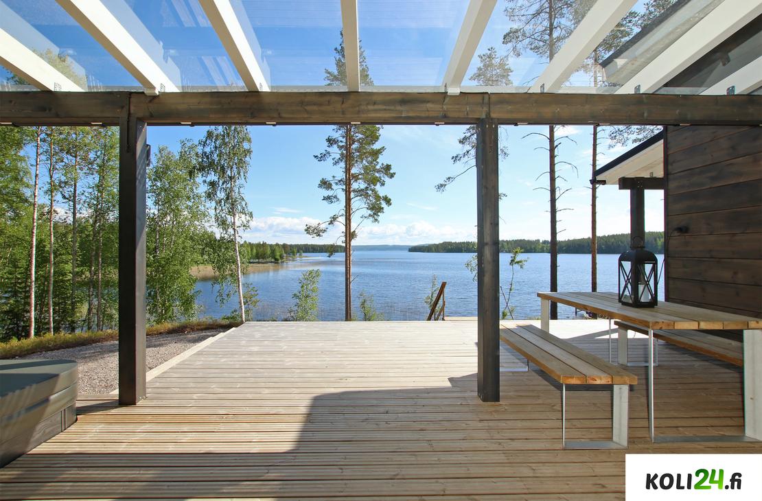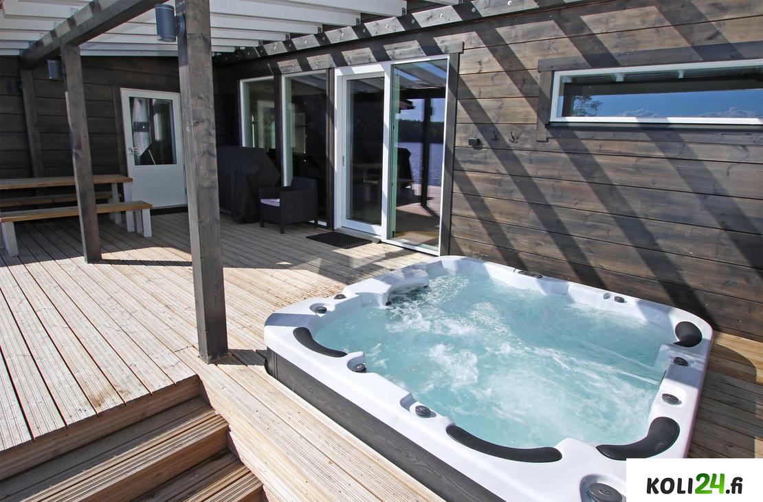 Tunnelmallisessa sähkösaunassa otat kuumat löylyt ennen järveen tai ulkoporeammeeseen pulahtamista. Terassilta löydät poreammeen lisäksi myös ison kaasugrillin.